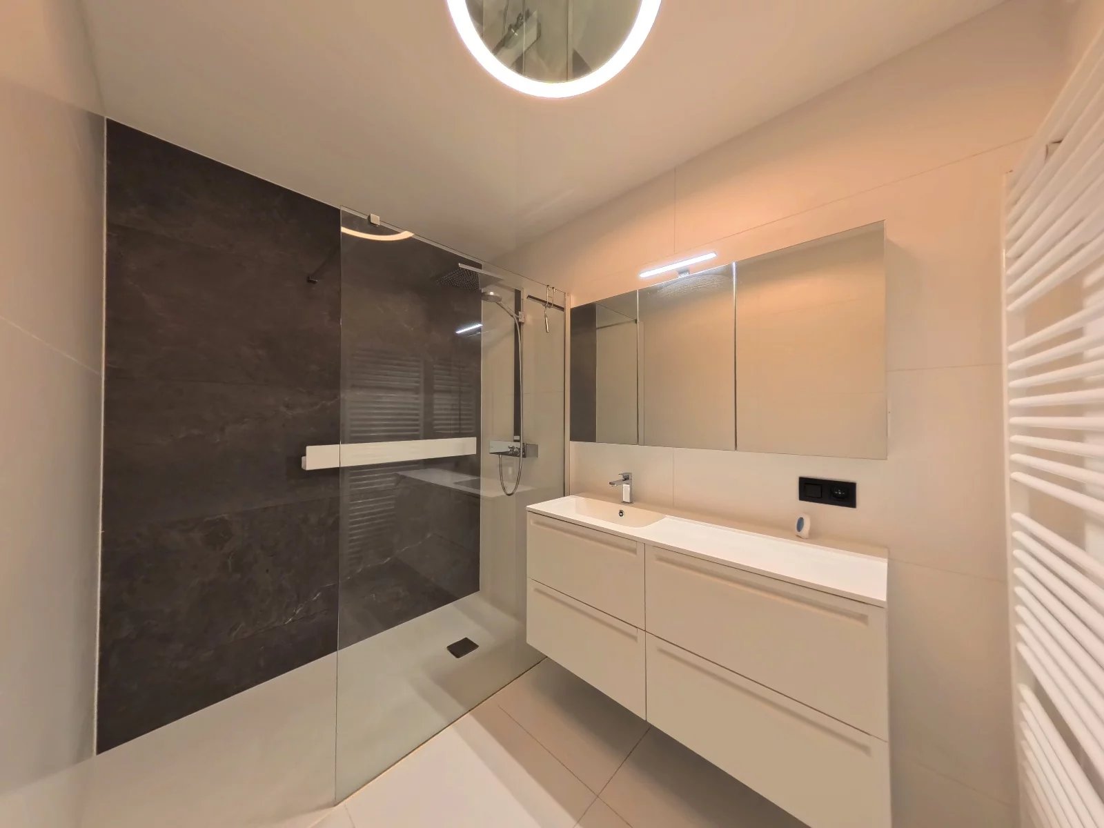 Auf dieser Etage befinden sich eine separate Toilette und ein schönes Badezimmer mit einer großen begehbaren Dusche, einem Spiegelschrank, einem Waschbeckenschrank und großen Schubladen zur Aufbewahrung.
