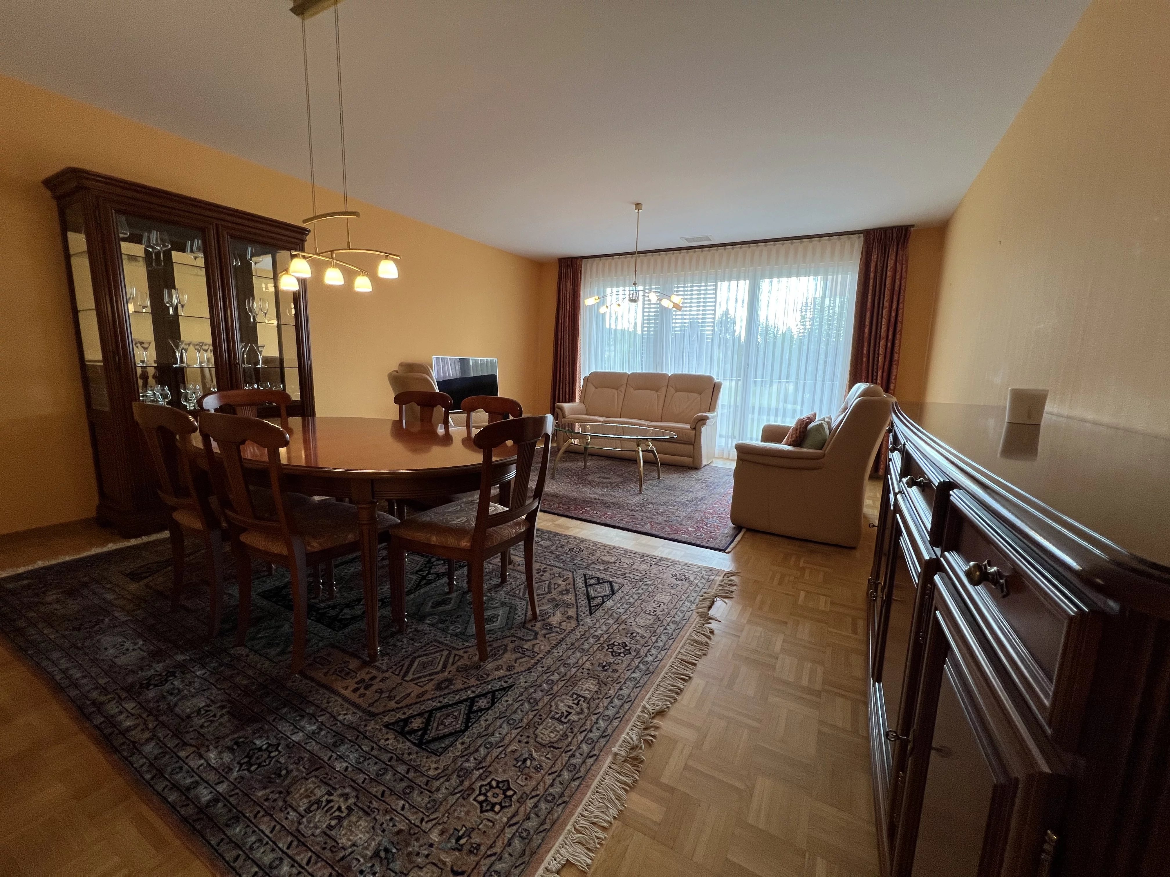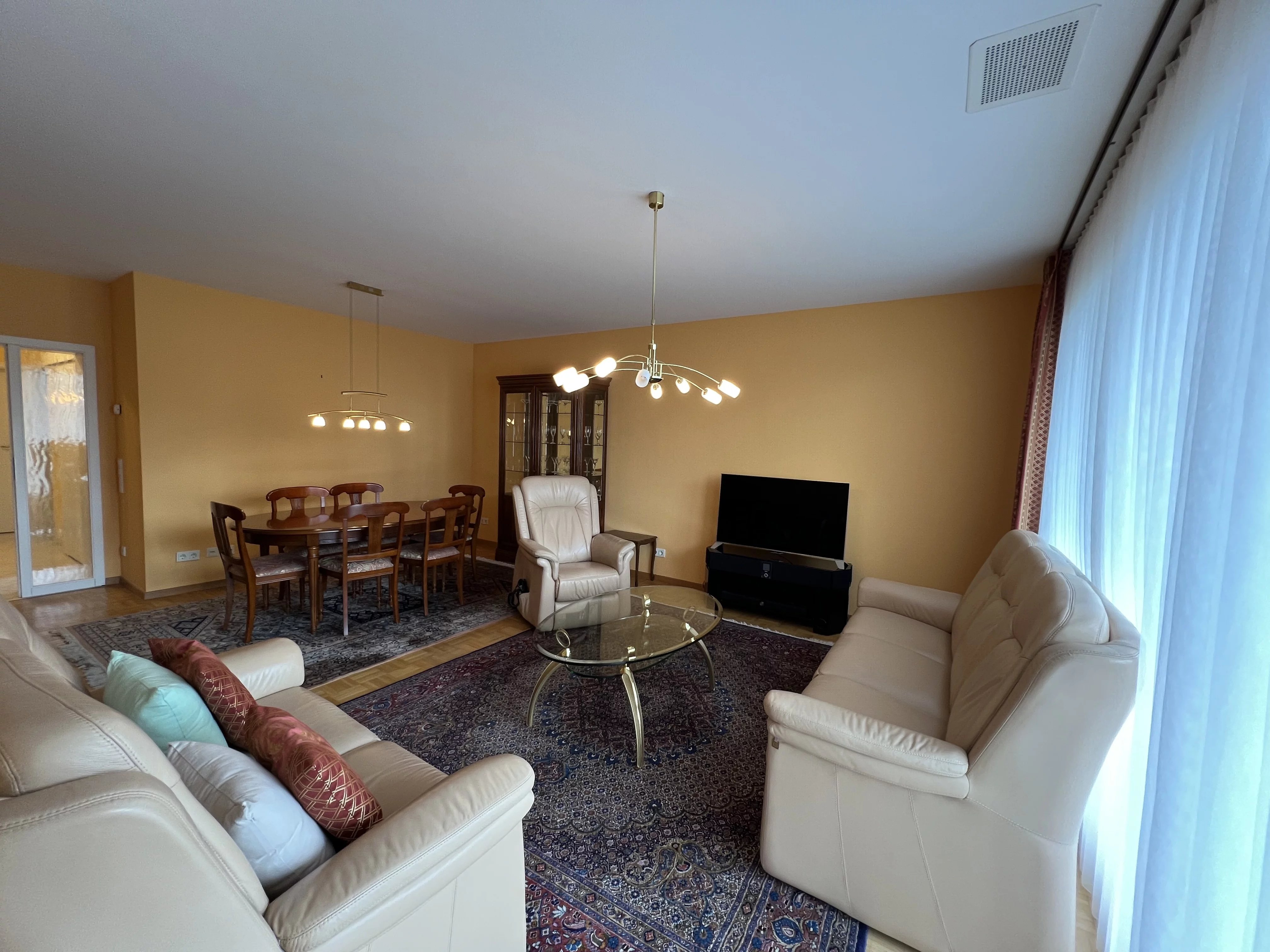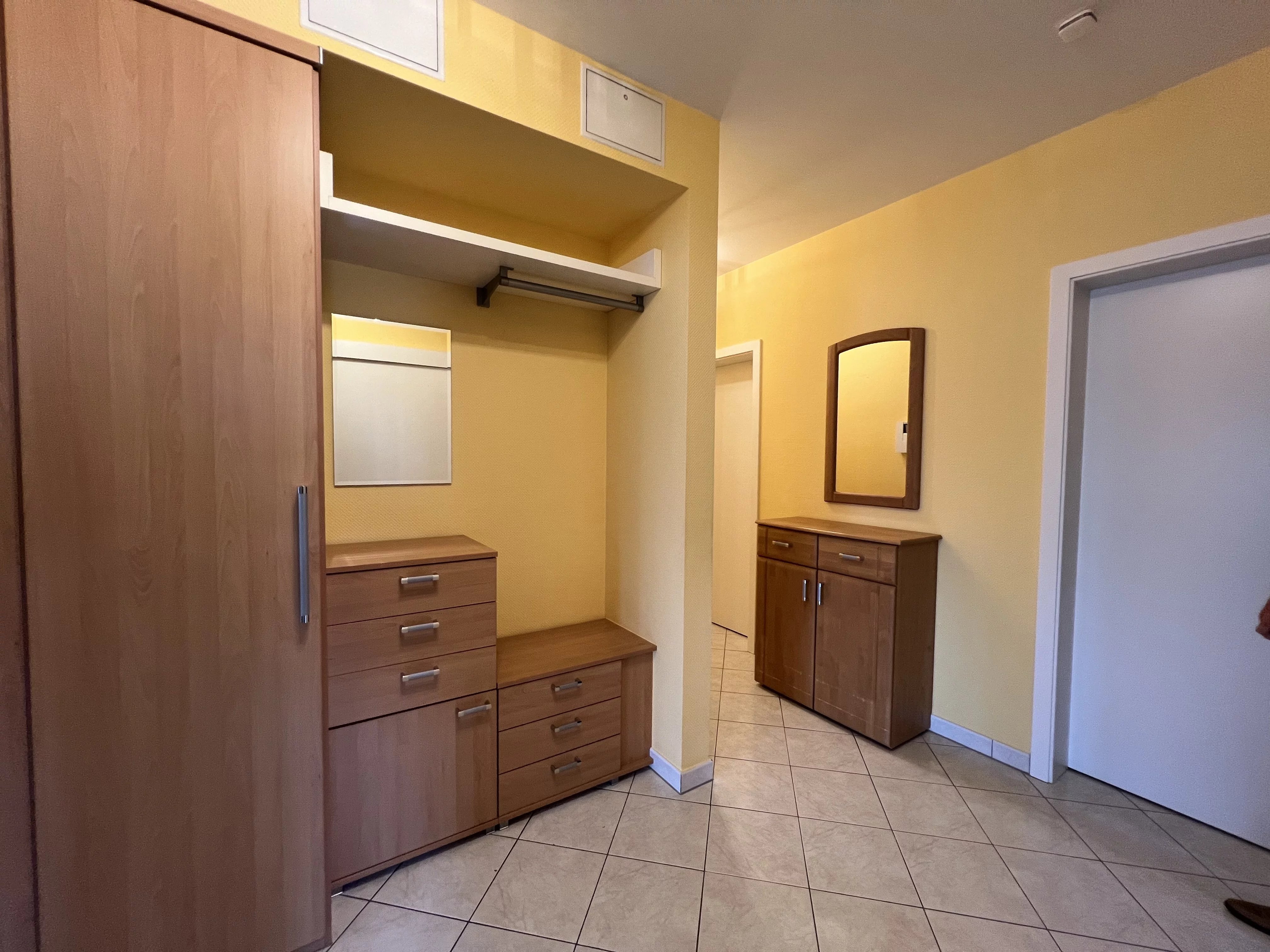 Sehr schöne möblierte Wohnung, Nr. 164, mit einer Wohnfläche von 95,00 m² und einem überdachten Balkon von 6,16 m². Dazu gehören ein Keller (Nr. 11) mit 5,52 m², ein Innenstellplatz (Nr. 35) im Untergeschoss mit 12,00 m² sowie ein privater Bereich mit Waschmaschine und Trockner in der Gemeinschaftswaschküche.