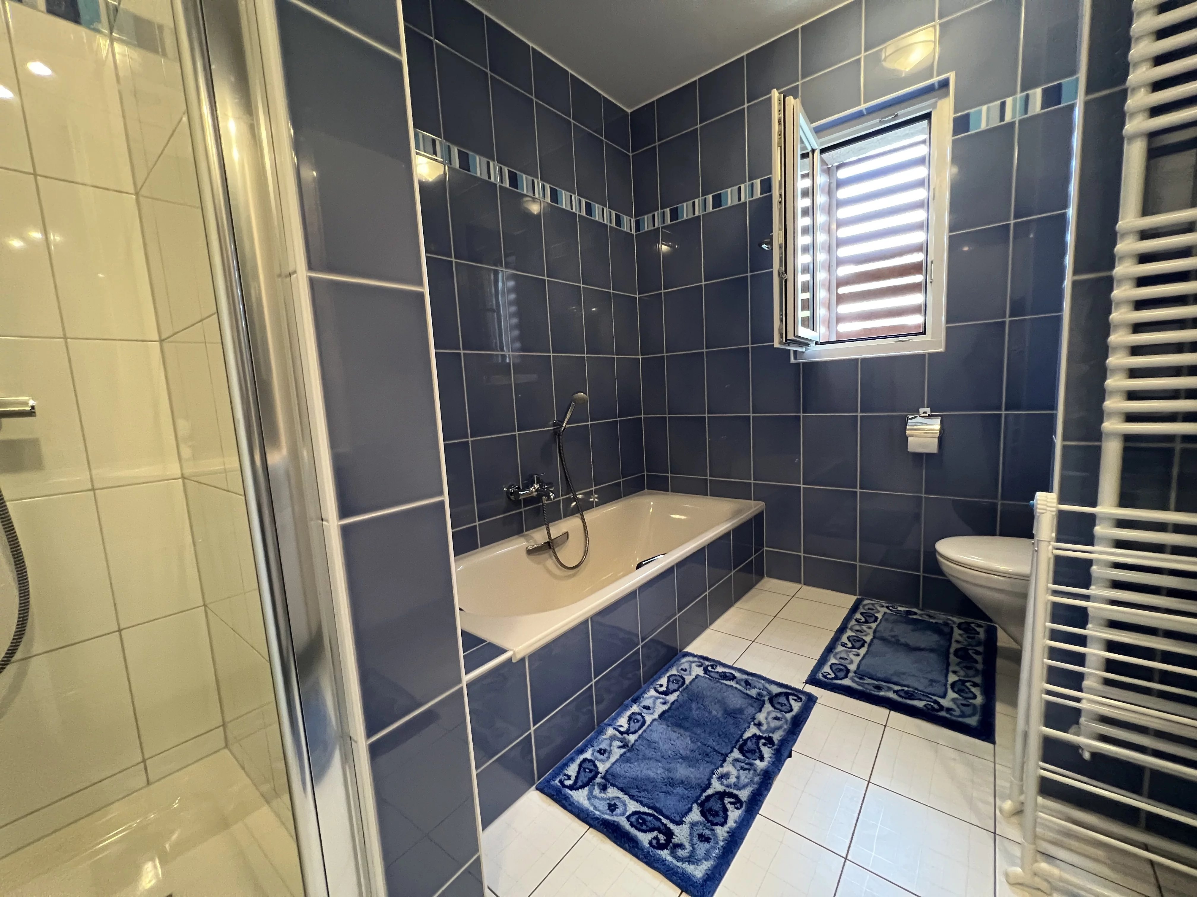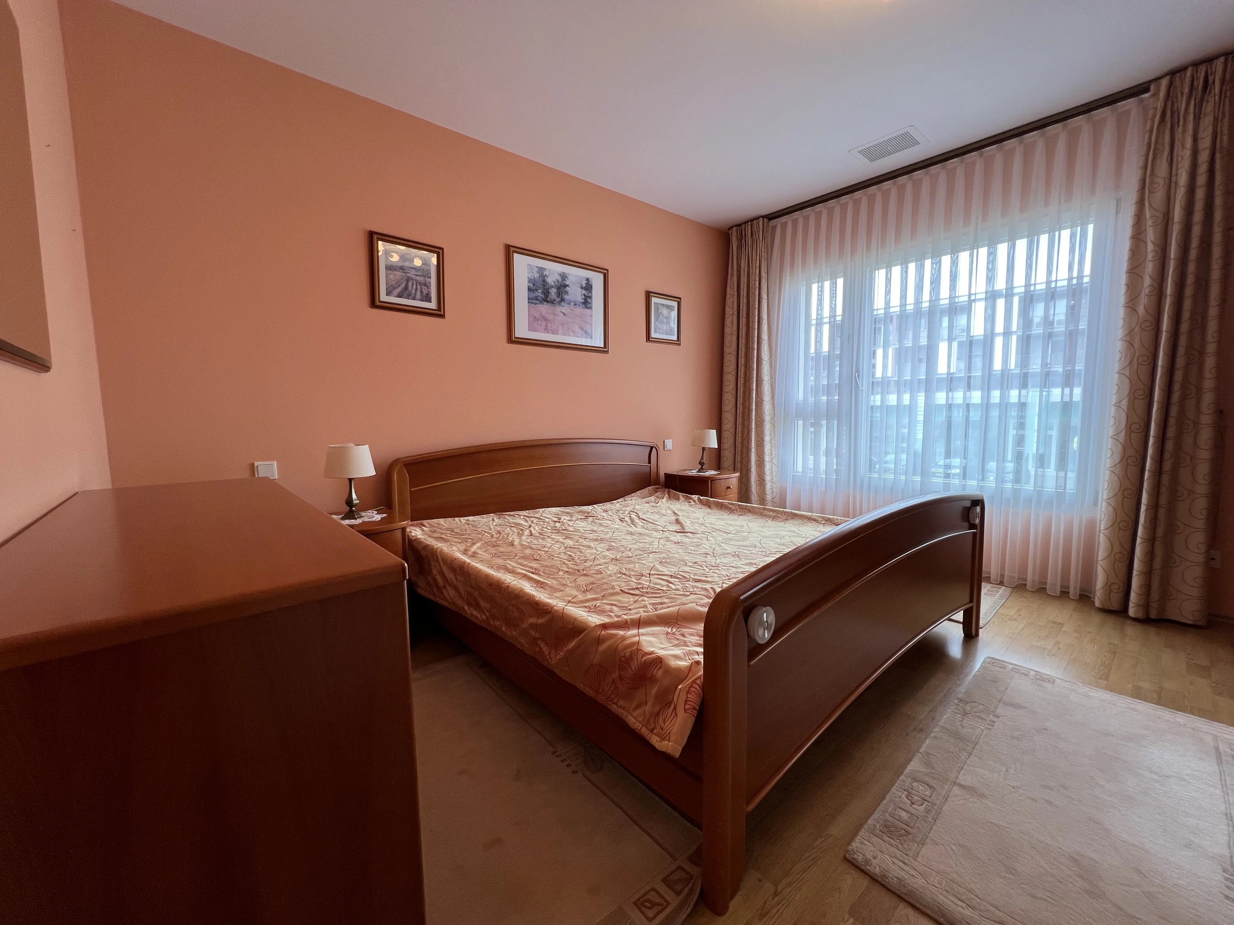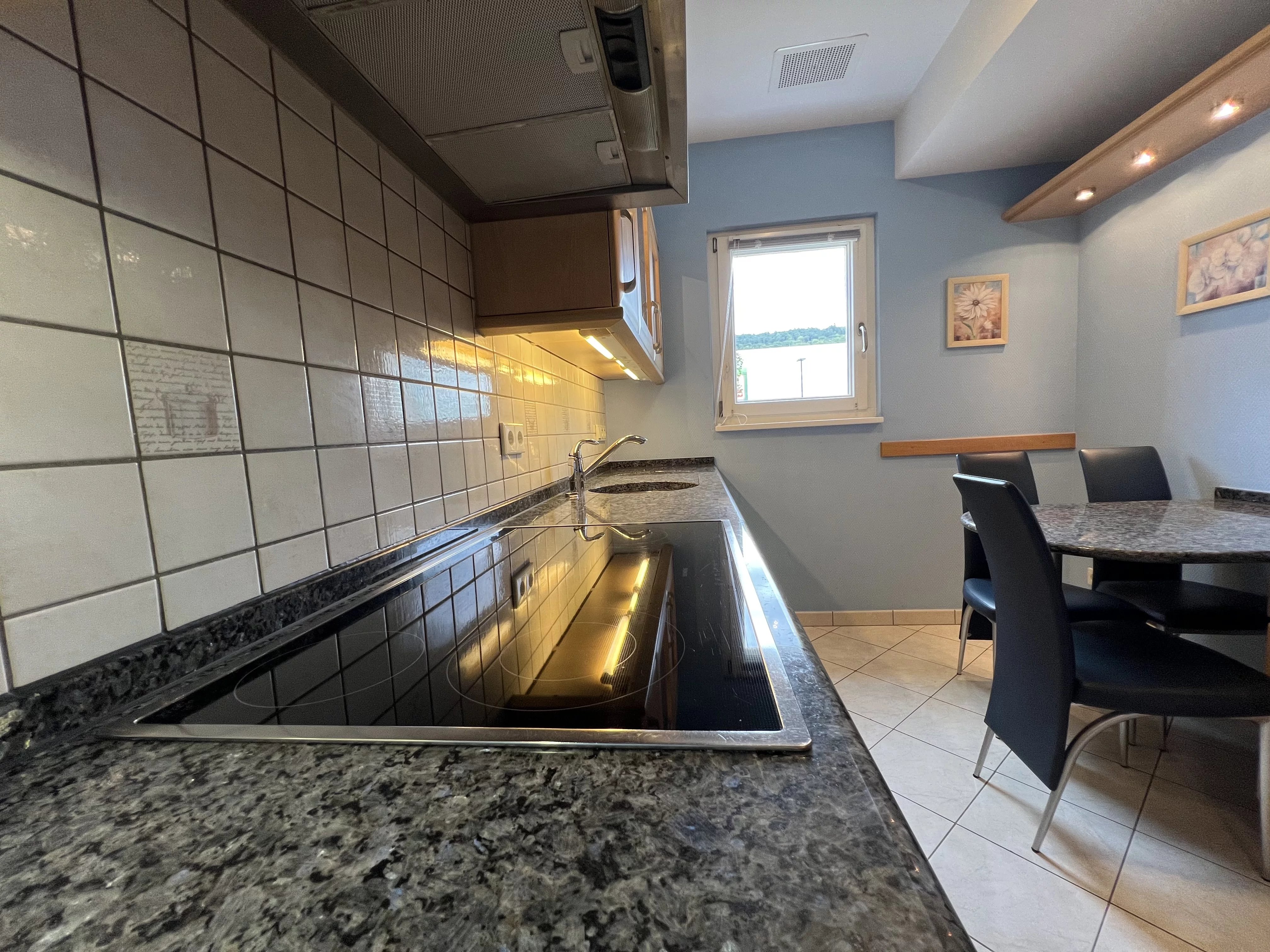 Sehr schöne möblierte Wohnung, Nr. 164, mit einer Wohnfläche von 95,00 m² und einem überdachten Balkon von 6,16 m². Dazu gehören ein Keller (Nr. 11) mit 5,52 m², ein Innenstellplatz (Nr. 35) im Untergeschoss mit 12,00 m² sowie ein privater Bereich mit Waschmaschine und Trockner in der Gemeinschaftswaschküche.