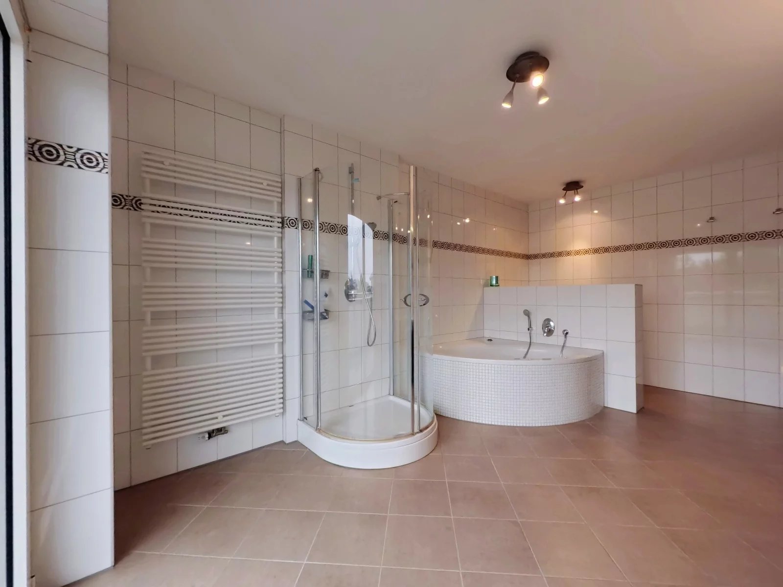 Une grande salle de bain de +- 16m2 composée d’une toilette suspendue, d’une baignoire d’angle, d’une cabine de douche, un meuble lavabo, son miroir et ses rangements, un WC invité, un espace buanderie viennent parfaire les nombreux atouts de cet appartement !