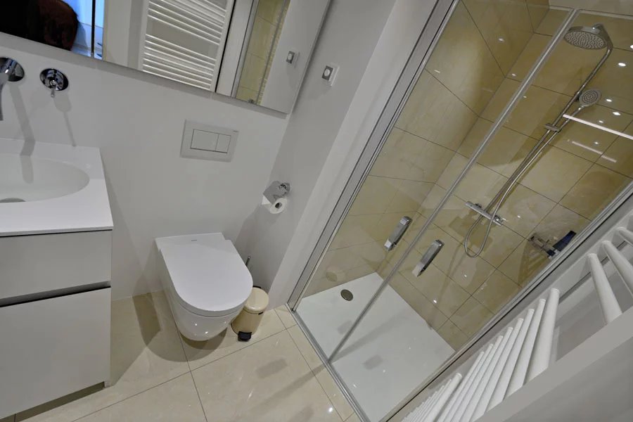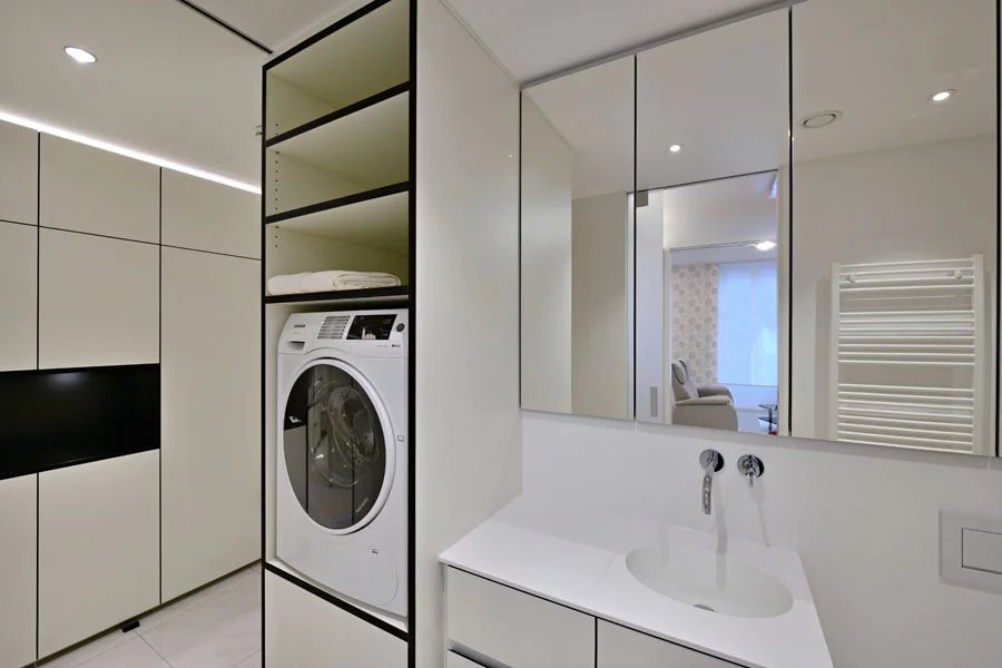 Bagno con doccia e WC, armadi, lavatrice e asciugatrice